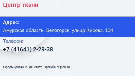 Центр ткани по адресу Амурская область, Белогорск, улица Кирова, 104 в дальнейшем Организация, размещена в следующих категориях: