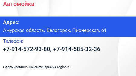 Автомойка по адресу Амурская область, Белогорск, Пионерская, 61 в дальнейшем Организация, размещена в следующих категориях: