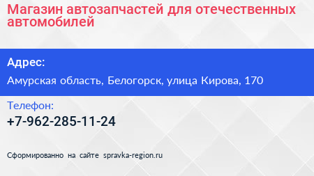 Магазин автозапчастей для отечественных автомобилей по адресу Амурская область, Белогорск, улица Кирова, 170 в дальнейшем Организация, размещена в следующих категориях: