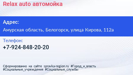 Relax auto, автомойка по адресу Амурская область, Белогорск, улица Кирова, 112а в дальнейшем Организация, размещена в следующих категориях: