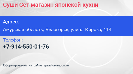 Суши Сет, магазин японской кухни по адресу Амурская область, Белогорск, улица Кирова, 114 в дальнейшем Организация, размещена в следующих категориях: