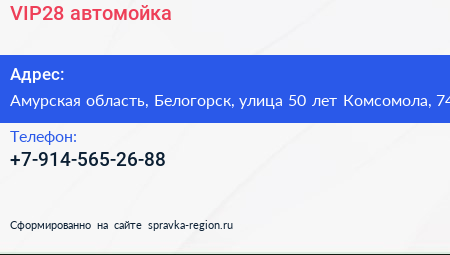 VIP28, автомойка по адресу Амурская область, Белогорск, улица 50 лет Комсомола, 74 в дальнейшем Организация, размещена в следующих категориях: