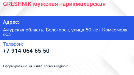 GRESHNIK, мужская парикмахерская по адресу Амурская область, Белогорск, улица 50 лет Комсомола, 60а в дальнейшем Организация, размещена в следующих категориях: