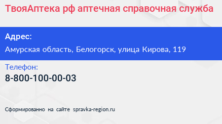 ТвояАптека.рф, аптечная справочная служба по адресу Амурская область, Белогорск, улица Кирова, 119 в дальнейшем Организация, размещена в следующих категориях: