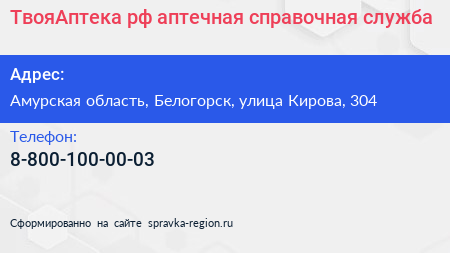 ТвояАптека.рф, аптечная справочная служба по адресу Амурская область, Белогорск, улица Кирова, 304 в дальнейшем Организация, размещена в следующих категориях: