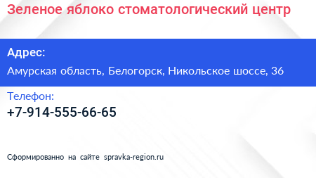 Зеленое яблоко, стоматологический центр по адресу Амурская область, Белогорск, Никольское шоссе, 36 в дальнейшем Организация, размещена в следующих категориях: