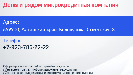 Деньги рядом, микрокредитная компания по адресу 659900, Алтайский край, Белокуриха, Советская, 3 в дальнейшем Организация, размещена в следующих категориях: