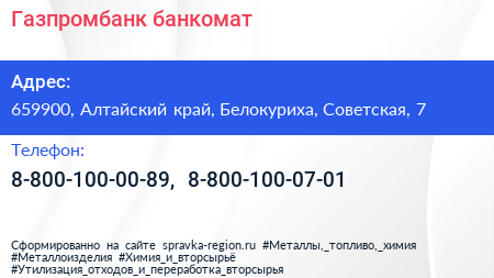 Газпромбанк, банкомат по адресу 659900, Алтайский край, Белокуриха, Советская, 7 в дальнейшем Организация, размещена в следующих категориях:
