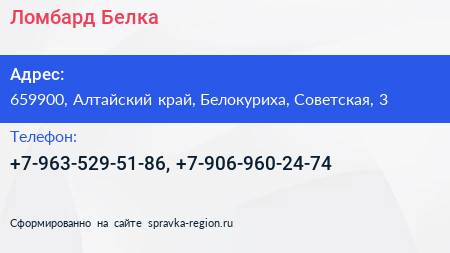 Ломбард Белка по адресу 659900, Алтайский край, Белокуриха, Советская, 3 в дальнейшем Организация, размещена в следующих категориях: