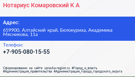 Нотариус Комаровский К.А. по адресу 659900, Алтайский край, Белокуриха, Академика Мясникова, 11а в дальнейшем Организация, размещена в следующих категориях: