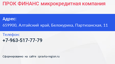 ПРОК ФИНАНС, микрокредитная компания по адресу 659900, Алтайский край, Белокуриха, Партизанская, 11 в дальнейшем Организация, размещена в следующих категориях: