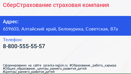 СберСтрахование, страховая компания по адресу 659603, Алтайский край, Белокуриха, Советская, 87а в дальнейшем Организация, размещена в следующих категориях: