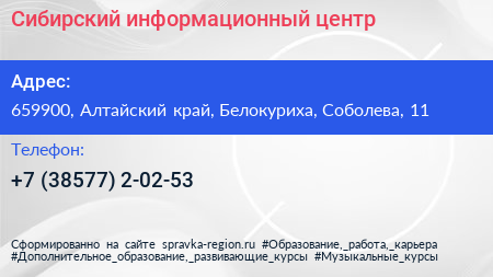 Сибирский информационный центр по адресу 659900, Алтайский край, Белокуриха, Соболева, 11 в дальнейшем Организация, размещена в следующих категориях: