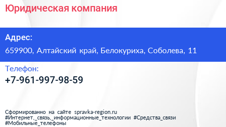 Юридическая компания по адресу 659900, Алтайский край, Белокуриха, Соболева, 11 в дальнейшем Организация, размещена в следующих категориях: