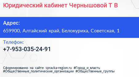Юридический кабинет Чернышовой Т.В. по адресу 659900, Алтайский край, Белокуриха, Советская, 1 в дальнейшем Организация, размещена в следующих категориях: