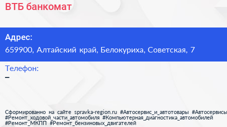 ВТБ, банкомат по адресу 659900, Алтайский край, Белокуриха, Советская, 7 в дальнейшем Организация, размещена в следующих категориях: