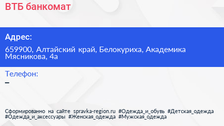 ВТБ, банкомат по адресу 659900, Алтайский край, Белокуриха, Академика Мясникова, 4а в дальнейшем Организация, размещена в следующих категориях: