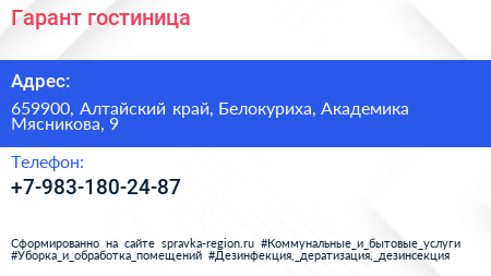 Гарант, гостиница по адресу 659900, Алтайский край, Белокуриха, Академика Мясникова, 9 в дальнейшем Организация, размещена в следующих категориях: