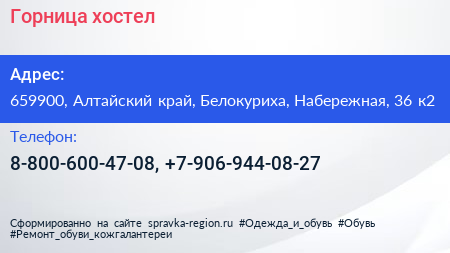 Горница, хостел по адресу 659900, Алтайский край, Белокуриха, Набережная, 36 к2 в дальнейшем Организация, размещена в следующих категориях: