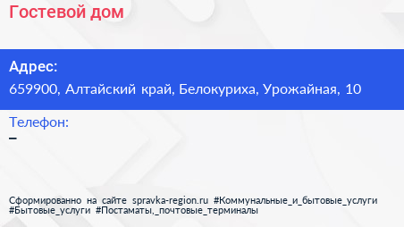 Гостевой дом по адресу 659900, Алтайский край, Белокуриха, Урожайная, 10 в дальнейшем Организация, размещена в следующих категориях: