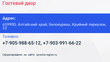 Гостевой двор по адресу 659900, Алтайский край, Белокуриха, Крайний переулок, 12 в дальнейшем Организация, размещена в следующих категориях: