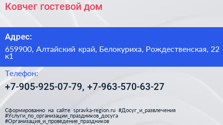 Ковчег, гостевой дом по адресу 659900, Алтайский край, Белокуриха, Рождественская, 22 к1 в дальнейшем Организация, размещена в следующих категориях: