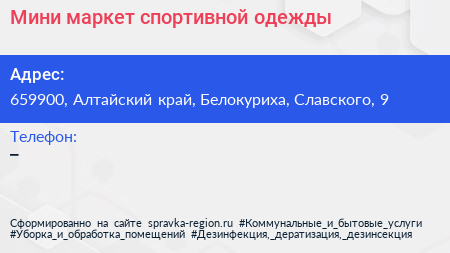 Мини-маркет спортивной одежды по адресу 659900, Алтайский край, Белокуриха, Славского, 9 в дальнейшем Организация, размещена в следующих категориях: