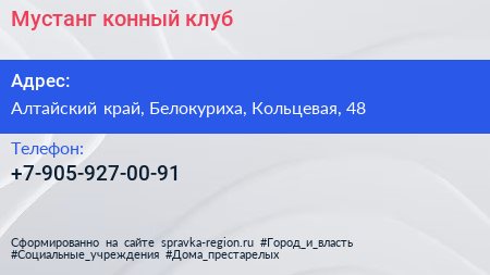 Мустанг, конный клуб по адресу Алтайский край, Белокуриха, Кольцевая, 48 в дальнейшем Организация, размещена в следующих категориях: