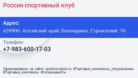 Россия, спортивный клуб по адресу 659900, Алтайский край, Белокуриха, Строителей, 76 в дальнейшем Организация, размещена в следующих категориях: