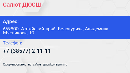 Салют, ДЮСШ по адресу 659900, Алтайский край, Белокуриха, Академика Мясникова, 10 в дальнейшем Организация, размещена в следующих категориях: