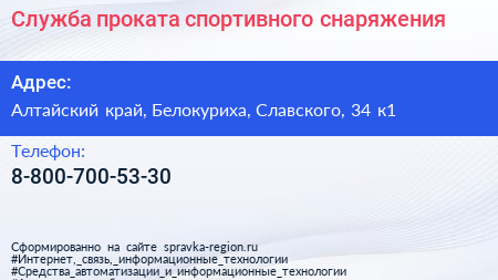 Служба проката спортивного снаряжения по адресу Алтайский край, Белокуриха, Славского, 34 к1 в дальнейшем Организация, размещена в следующих категориях: