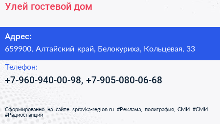 Улей, гостевой дом по адресу 659900, Алтайский край, Белокуриха, Кольцевая, 33 в дальнейшем Организация, размещена в следующих категориях: