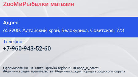 ZooМиРыбалки, магазин по адресу 659900, Алтайский край, Белокуриха, Советская, 7/3 в дальнейшем Организация, размещена в следующих категориях: