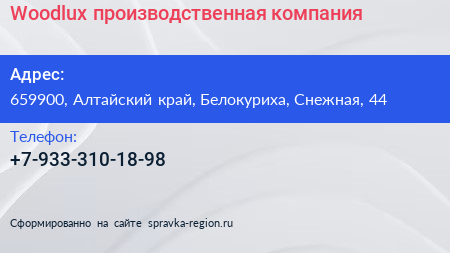 Woodlux, производственная компания по адресу 659900, Алтайский край, Белокуриха, Снежная, 44 в дальнейшем Организация, размещена в следующих категориях: