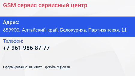 GSM-сервис, сервисный центр по адресу 659900, Алтайский край, Белокуриха, Партизанская, 11 в дальнейшем Организация, размещена в следующих категориях: