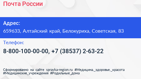Почта России по адресу 659633, Алтайский край, Белокуриха, Советская, 83 в дальнейшем Организация, размещена в следующих категориях: