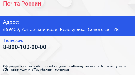 Почта России по адресу 659602, Алтайский край, Белокуриха, Советская, 78 в дальнейшем Организация, размещена в следующих категориях: