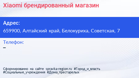 Xiaomi, брендированный магазин по адресу 659900, Алтайский край, Белокуриха, Советская, 7 в дальнейшем Организация, размещена в следующих категориях: