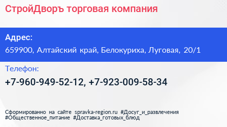 СтройДворъ, торговая компания по адресу 659900, Алтайский край, Белокуриха, Луговая, 20/1 в дальнейшем Организация, размещена в следующих категориях: