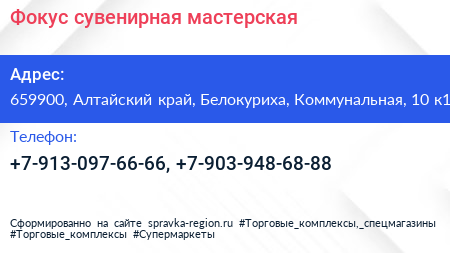 Фокус, сувенирная мастерская по адресу 659900, Алтайский край, Белокуриха, Коммунальная, 10 к1 в дальнейшем Организация, размещена в следующих категориях: