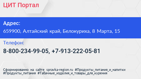 ЦИТ Портал по адресу 659900, Алтайский край, Белокуриха, 8 Марта, 15 в дальнейшем Организация, размещена в следующих категориях: