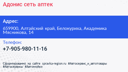 Адонис, сеть аптек по адресу 659900, Алтайский край, Белокуриха, Академика Мясникова, 14 в дальнейшем Организация, размещена в следующих категориях: