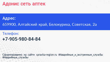 Адонис, сеть аптек по адресу 659900, Алтайский край, Белокуриха, Советская, 2а в дальнейшем Организация, размещена в следующих категориях: