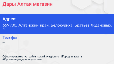 Дары Алтая, магазин по адресу 659900, Алтайский край, Белокуриха, Братьев Ждановых, 4 в дальнейшем Организация, размещена в следующих категориях: