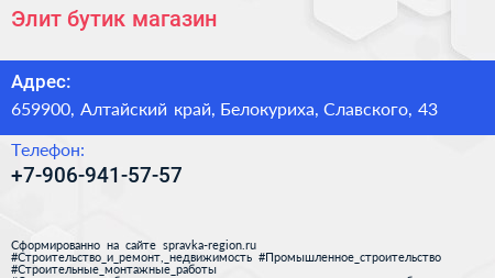 Элит-бутик, магазин по адресу 659900, Алтайский край, Белокуриха, Славского, 43 в дальнейшем Организация, размещена в следующих категориях: