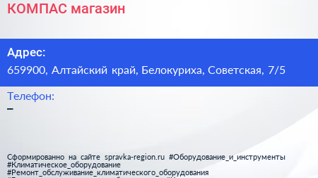 КОМПАС, магазин по адресу 659900, Алтайский край, Белокуриха, Советская, 7/5 в дальнейшем Организация, размещена в следующих категориях: