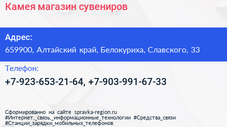 Камея, магазин сувениров по адресу 659900, Алтайский край, Белокуриха, Славского, 33 в дальнейшем Организация, размещена в следующих категориях: