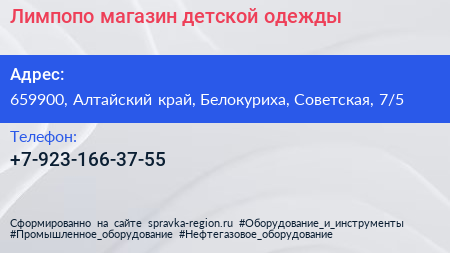 Лимпопо, магазин детской одежды по адресу 659900, Алтайский край, Белокуриха, Советская, 7/5 в дальнейшем Организация, размещена в следующих категориях:
