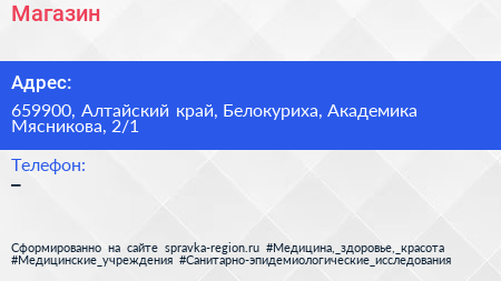 Магазин по адресу 659900, Алтайский край, Белокуриха, Академика Мясникова, 2/1 в дальнейшем Организация, размещена в следующих категориях: