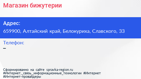 Магазин бижутерии по адресу 659900, Алтайский край, Белокуриха, Славского, 33 в дальнейшем Организация, размещена в следующих категориях: